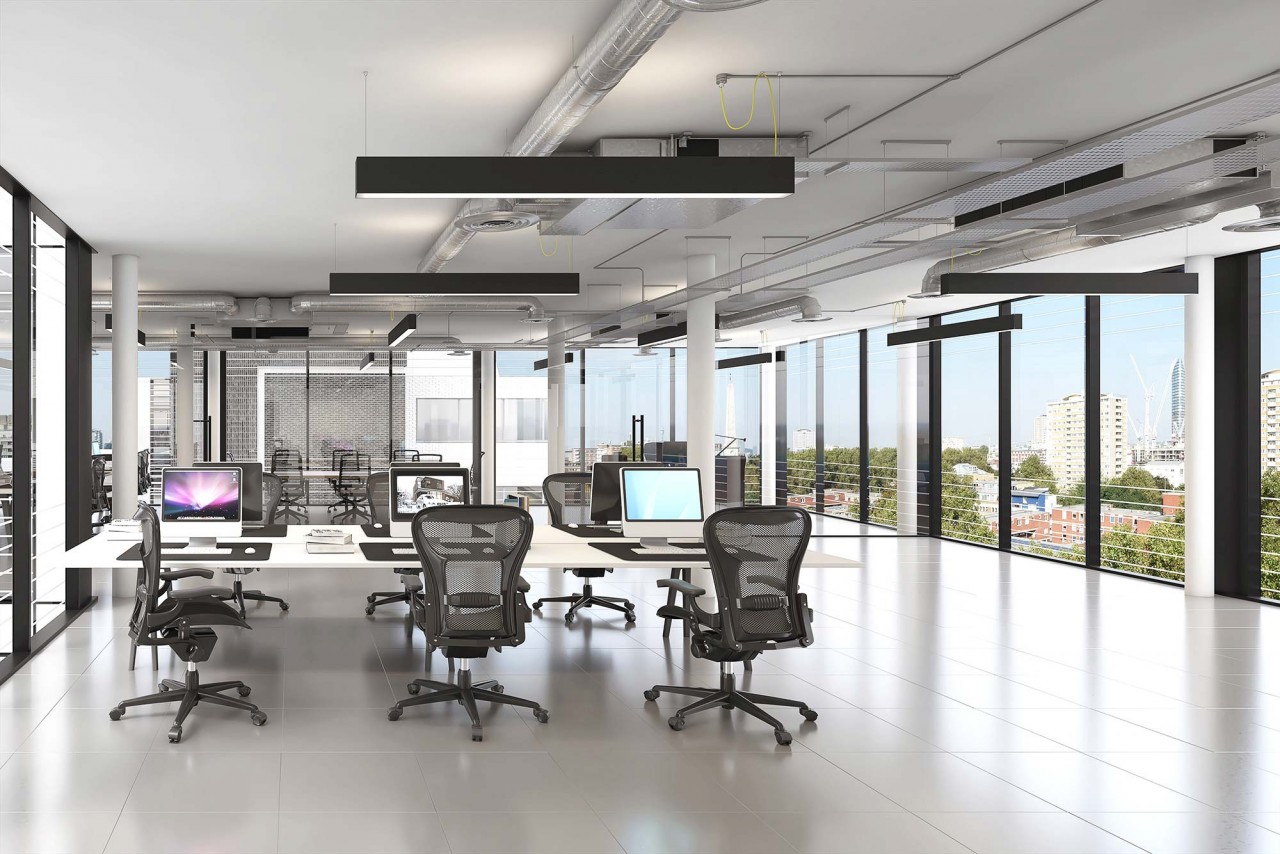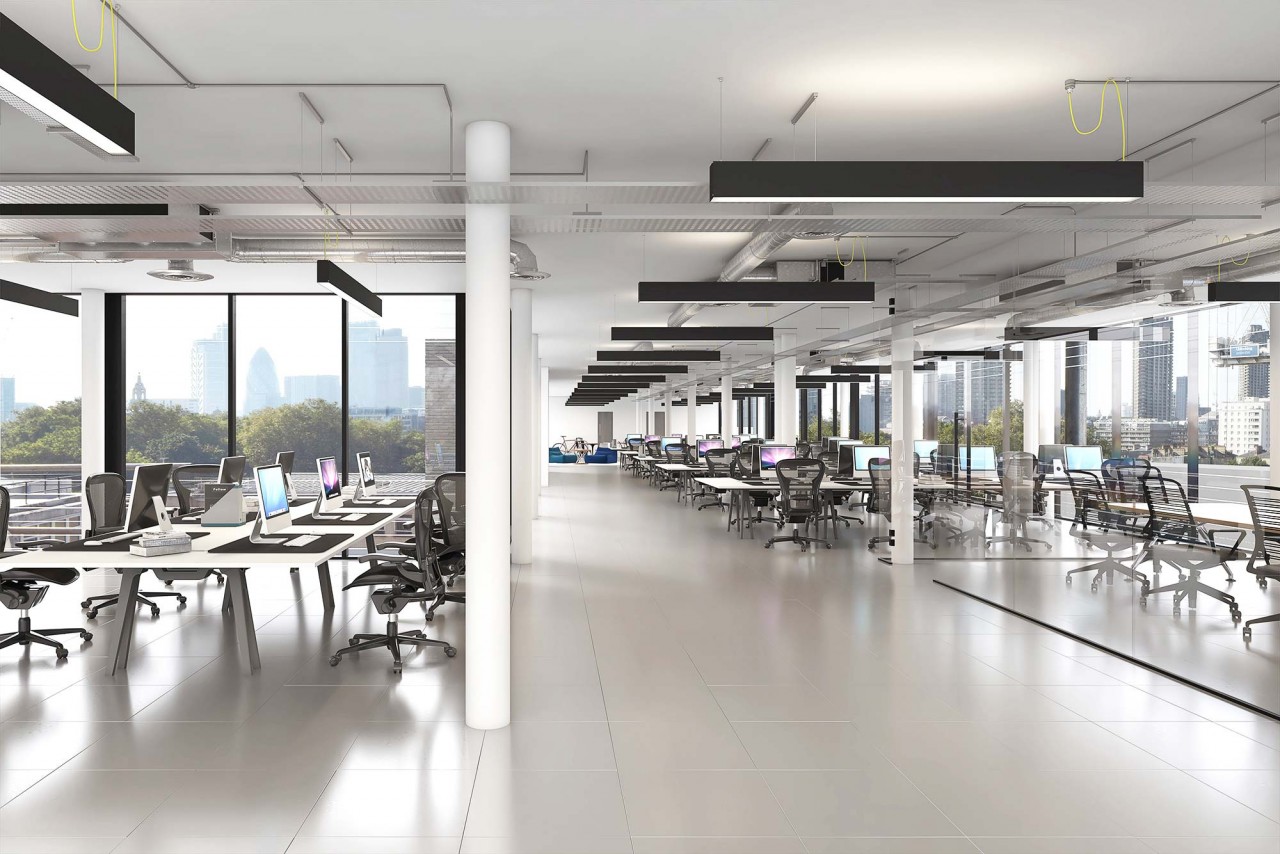 The images emphasise the desirable features of a modern office space: excellent levels of natural daylight throughout, new modern suspended lighting, exposed galvanised comfort cooling system along with floor to ceiling glazing providing sensational panoramic views across London.