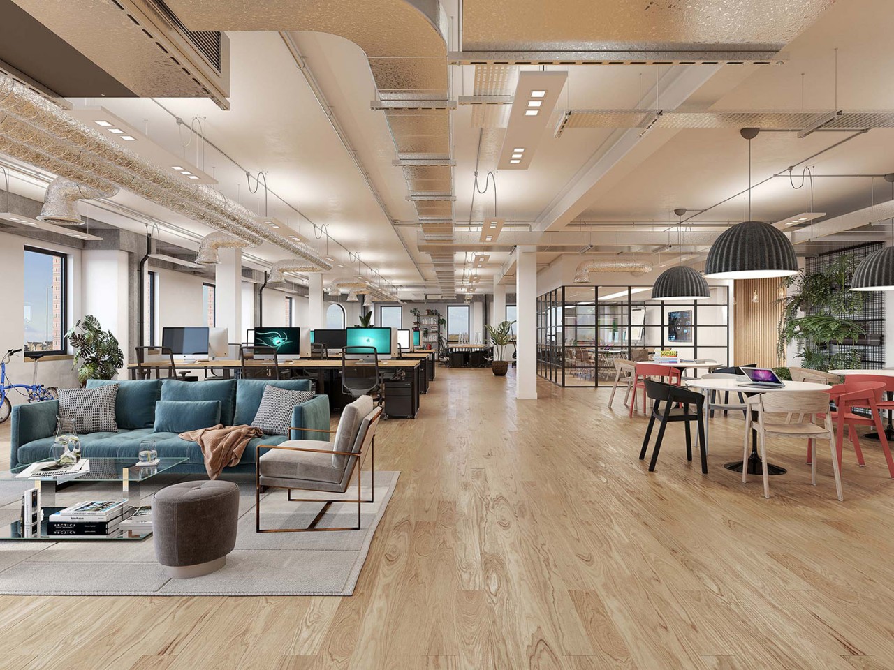 The office CGI gives a chance to see what the floor plate could look like, with its flexible space, exposed services and new LED lighting.