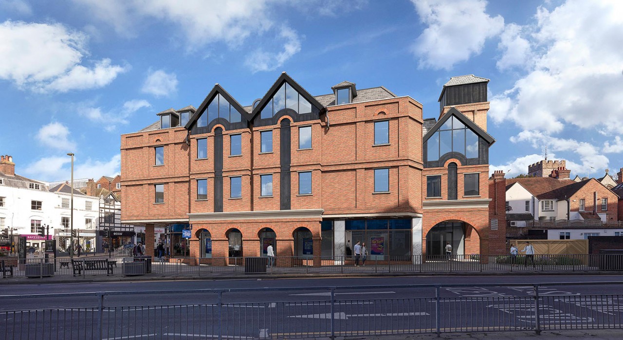 Located in the Guildford Town Centre Conservation area, Crossweys House is a landmark building that was redeveloped in the late 1980s. It presents a selections of materials typical of the period, including red facing brickwork and brick arches, stone parapets and cornices and oak storefront with marble cladding to piers.