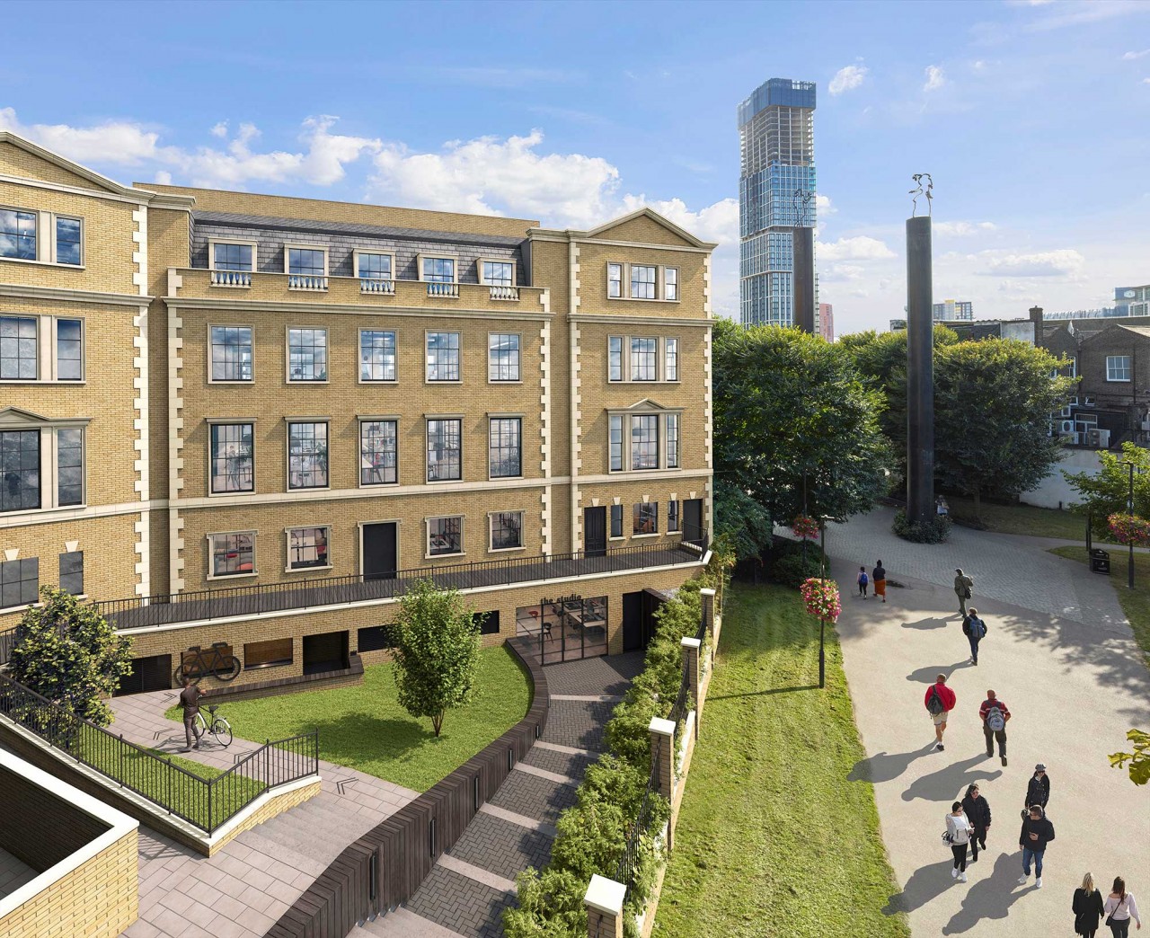 The exterior photomontages reproduce the original features of the building and showcase the new design of the rear terrace and courtyard, which is easily accessible via the river path and comprehends a new bike storage facility.